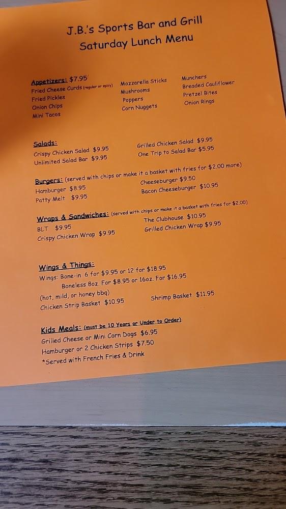 The menu at J.B.'s offers something for everyone. Start with classic appetizers like onion chips or mini tacos. For heartier meals, the burger options are favorites, especially the cheeseburger and patty melt.